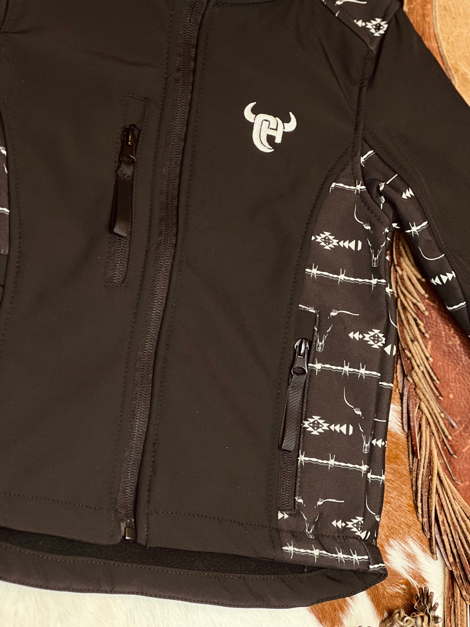 An amazing quality soft shell jacket. Double lined and warm for your little cowkid.
