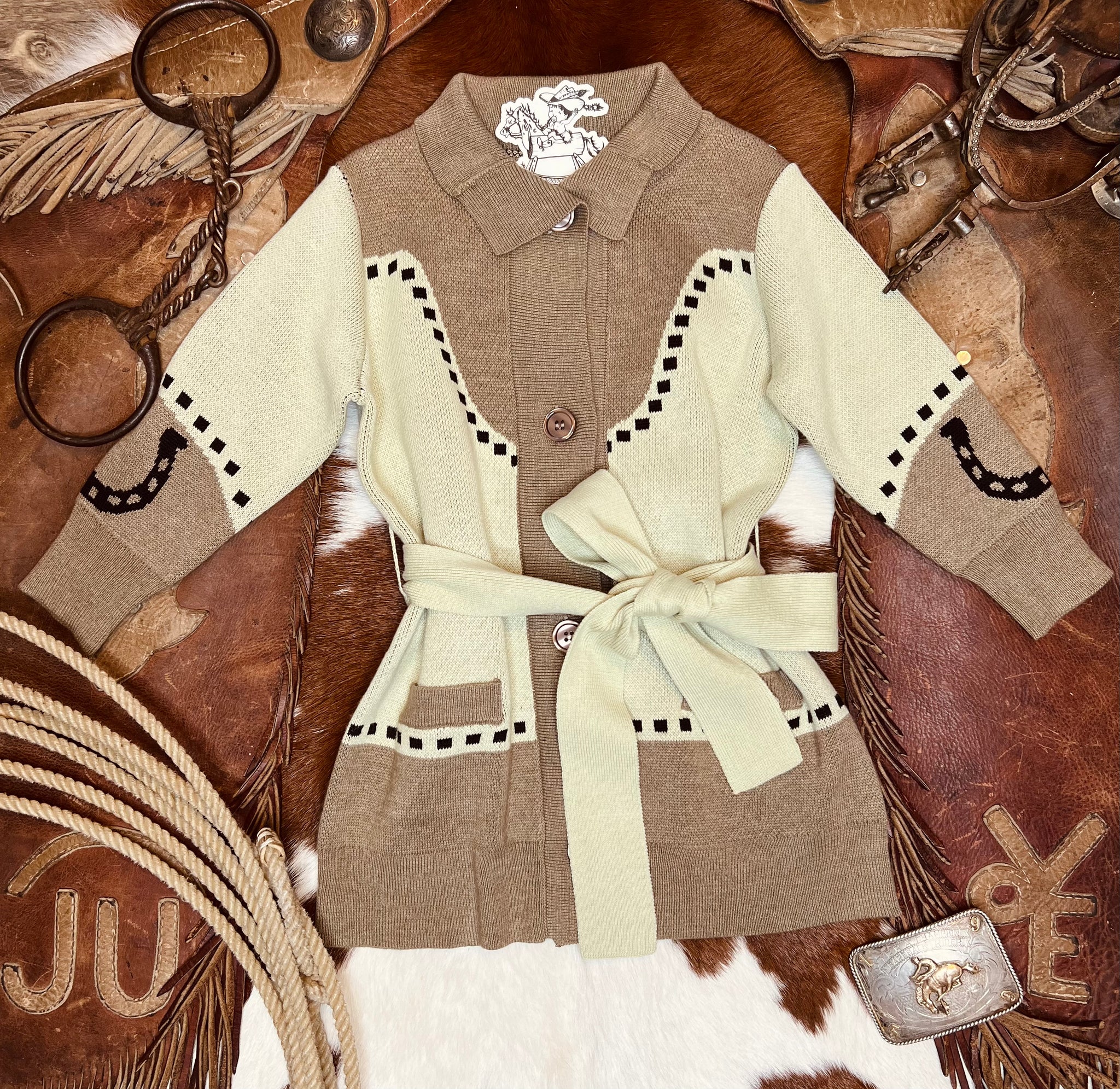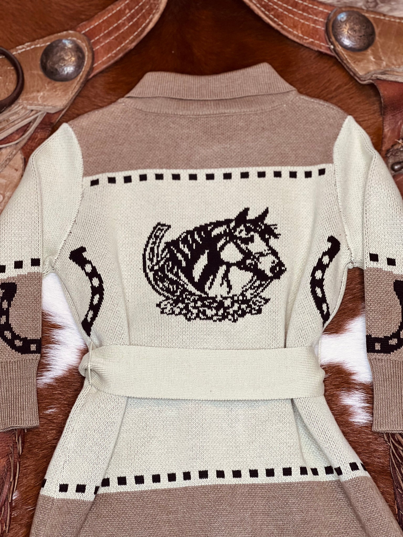 The best western detailed cardigan complete with buttons and waist tie closure. Has the cutest horse and horse shoe detail on the back.