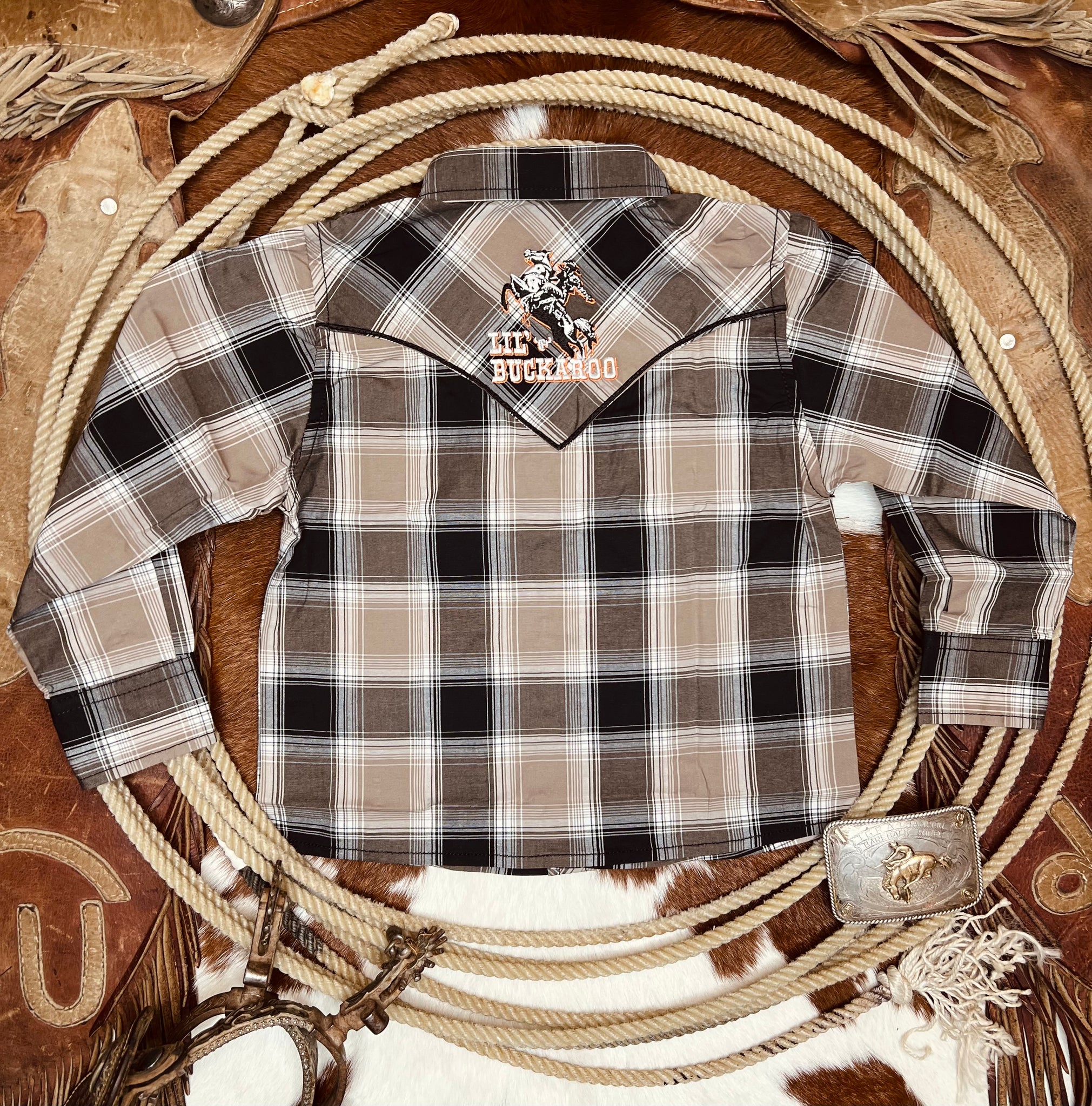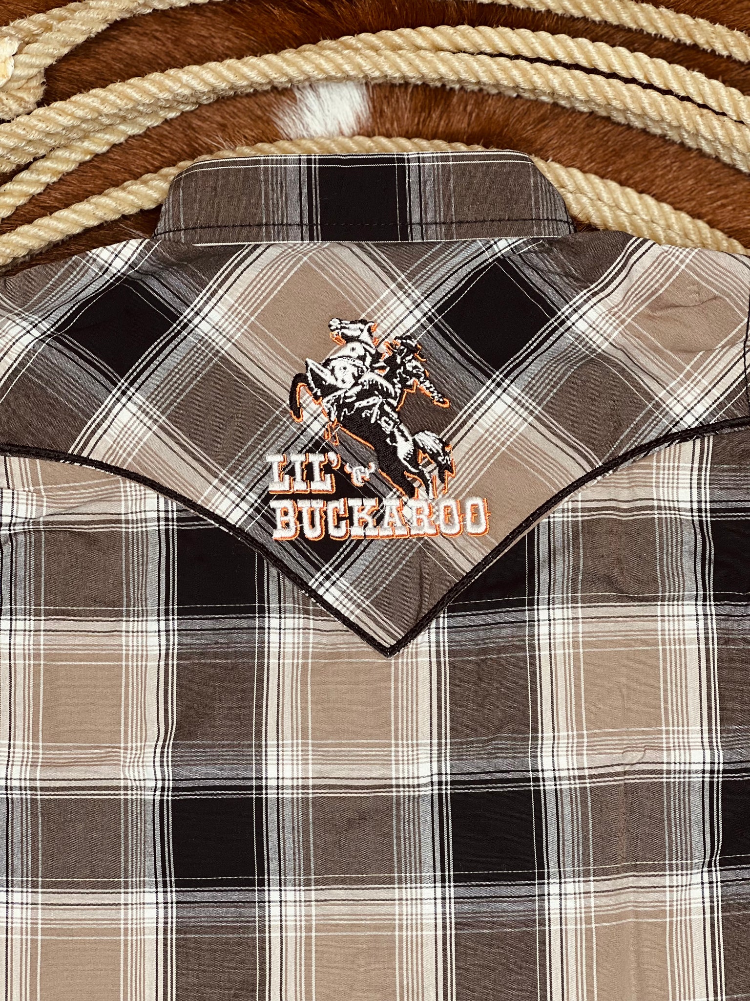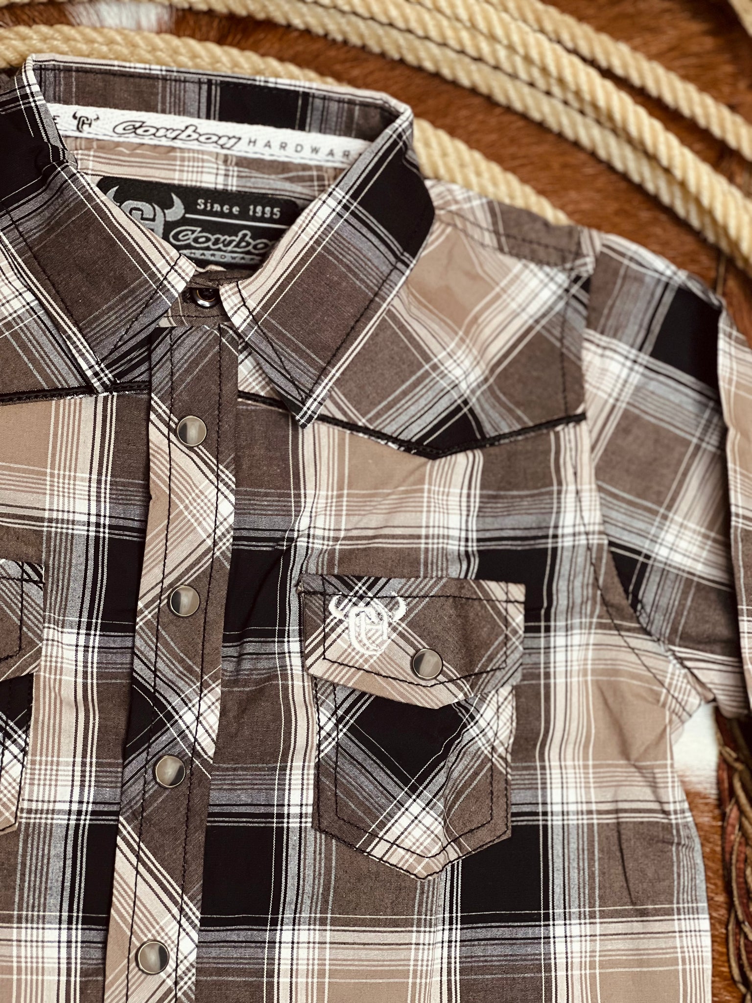 The perfect subtle western pearl snap. A cool black tan and cream plaid color.