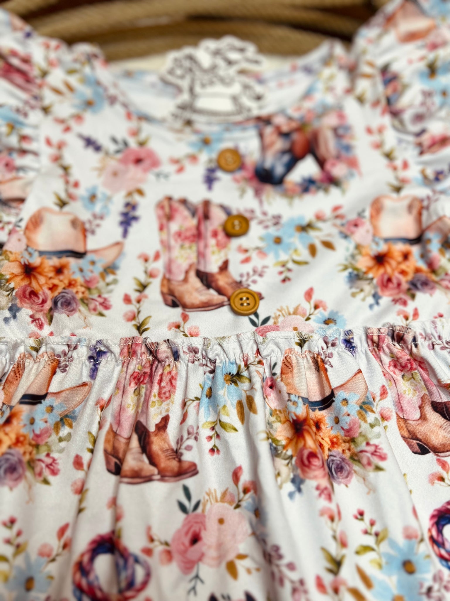 The perfect little girls dress, ready for twirling. Complete with a western graphic collage on it.