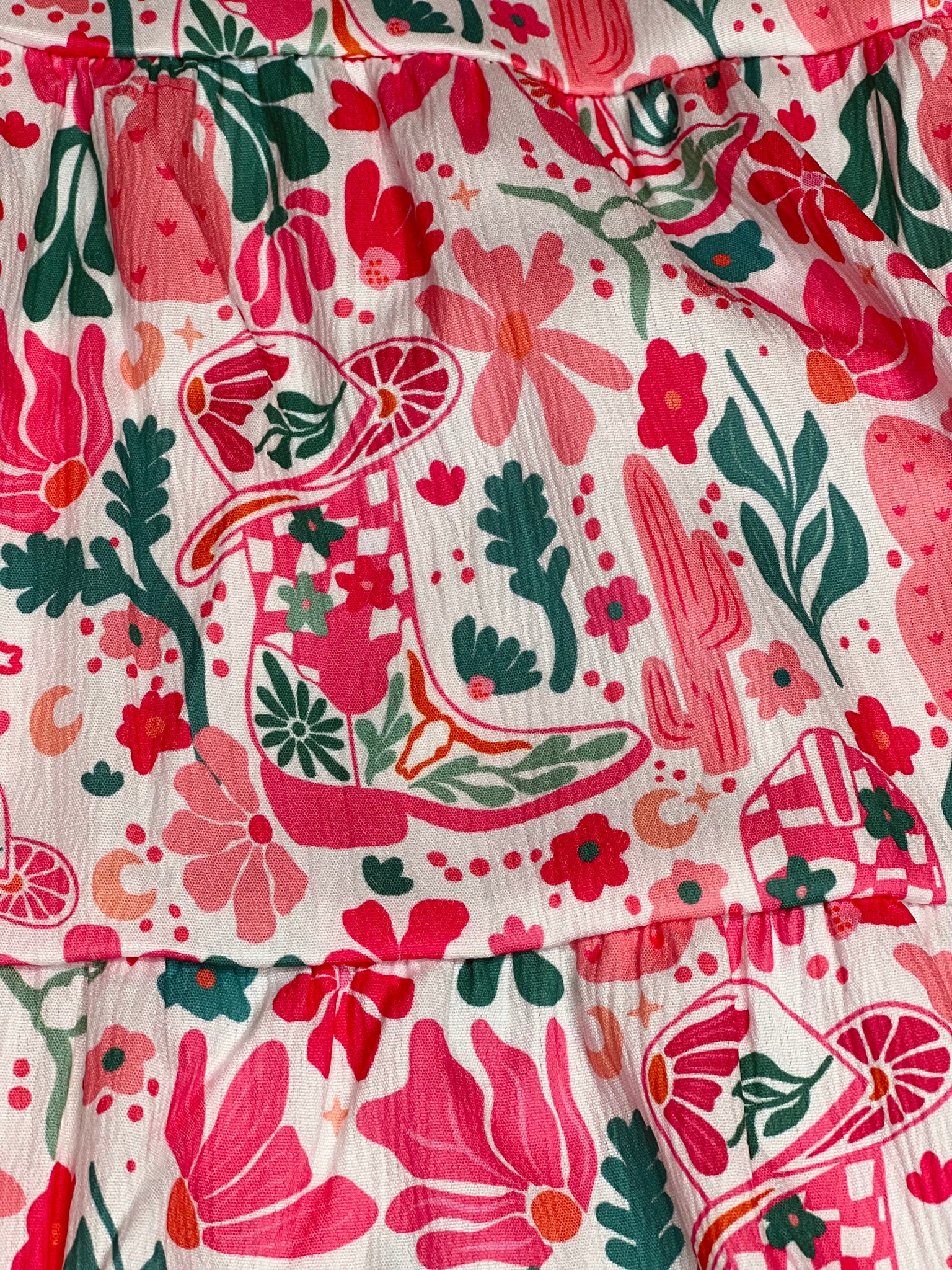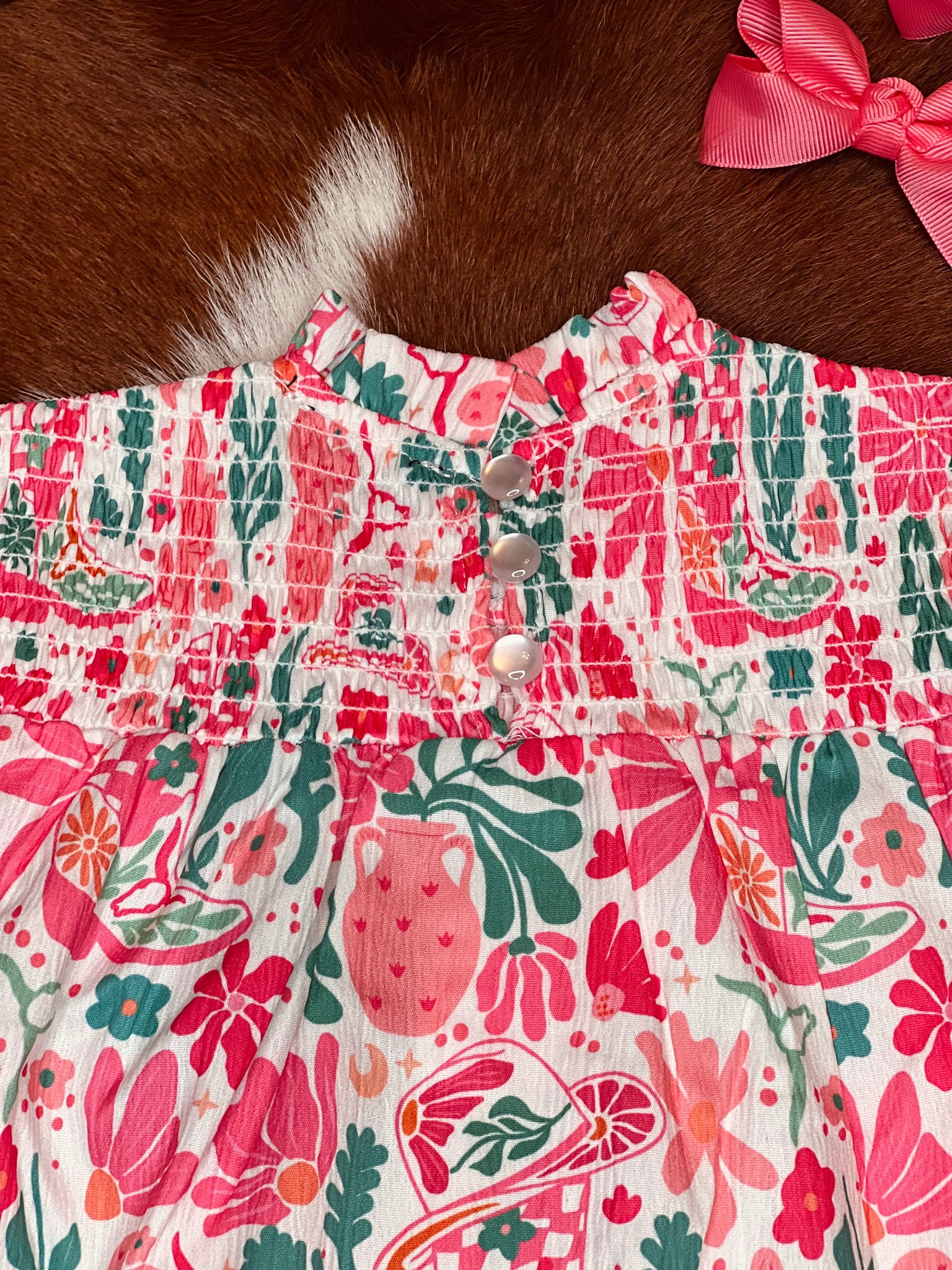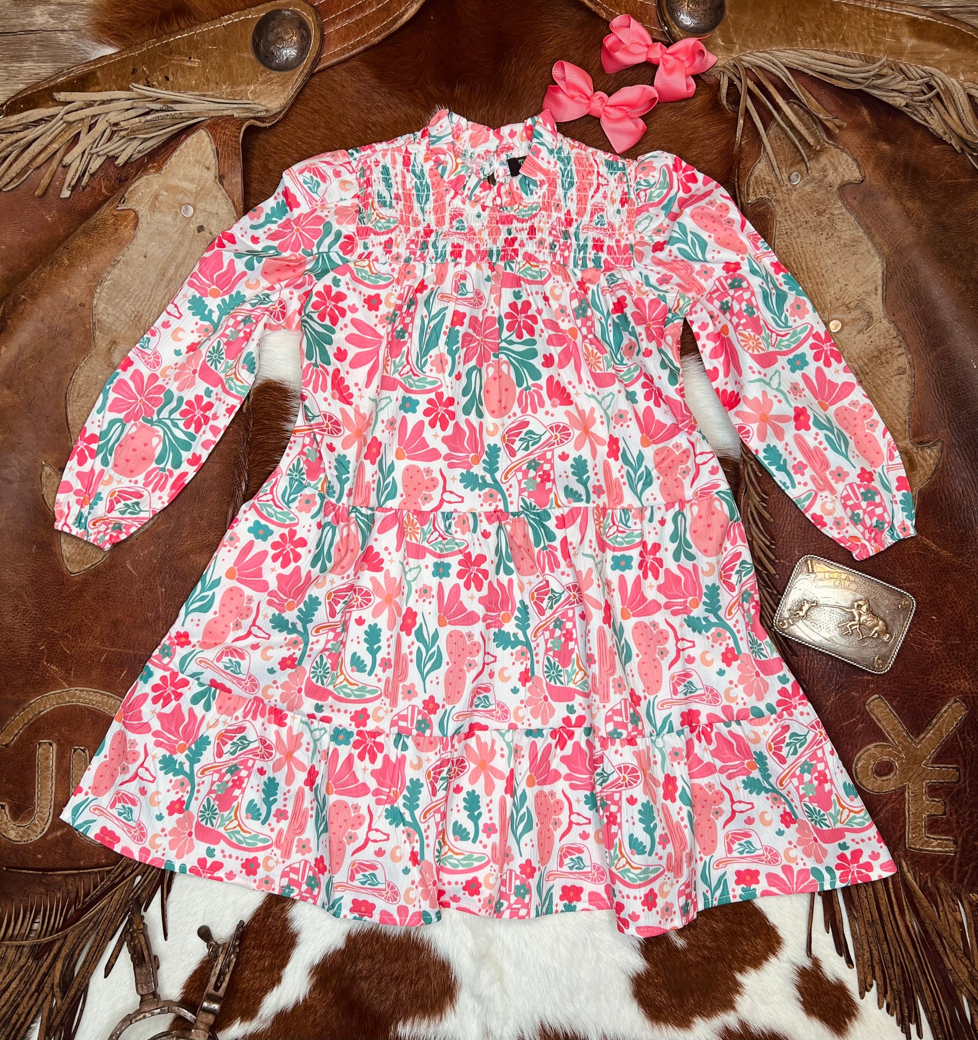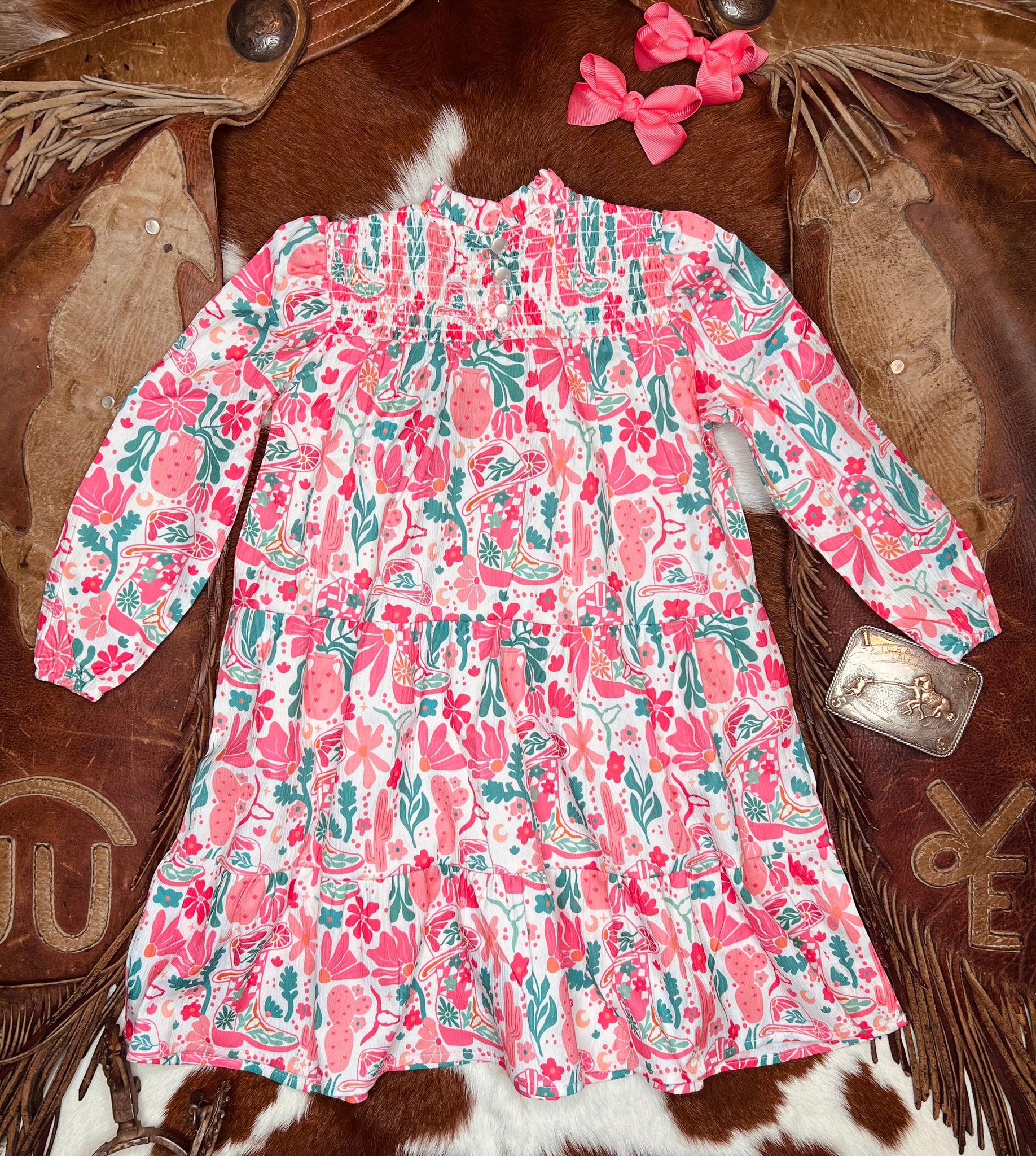 Sweet, playful, and full of western charm—this adorable long sleeve dress is perfect for your little cowgirl. Featuring a vibrant cactus and floral print in soft pinks and greens, it brings a fun desert-inspired vibe to any occasion. The smocked neckline adds a touch of texture while keeping the fit comfy and easy to wear.