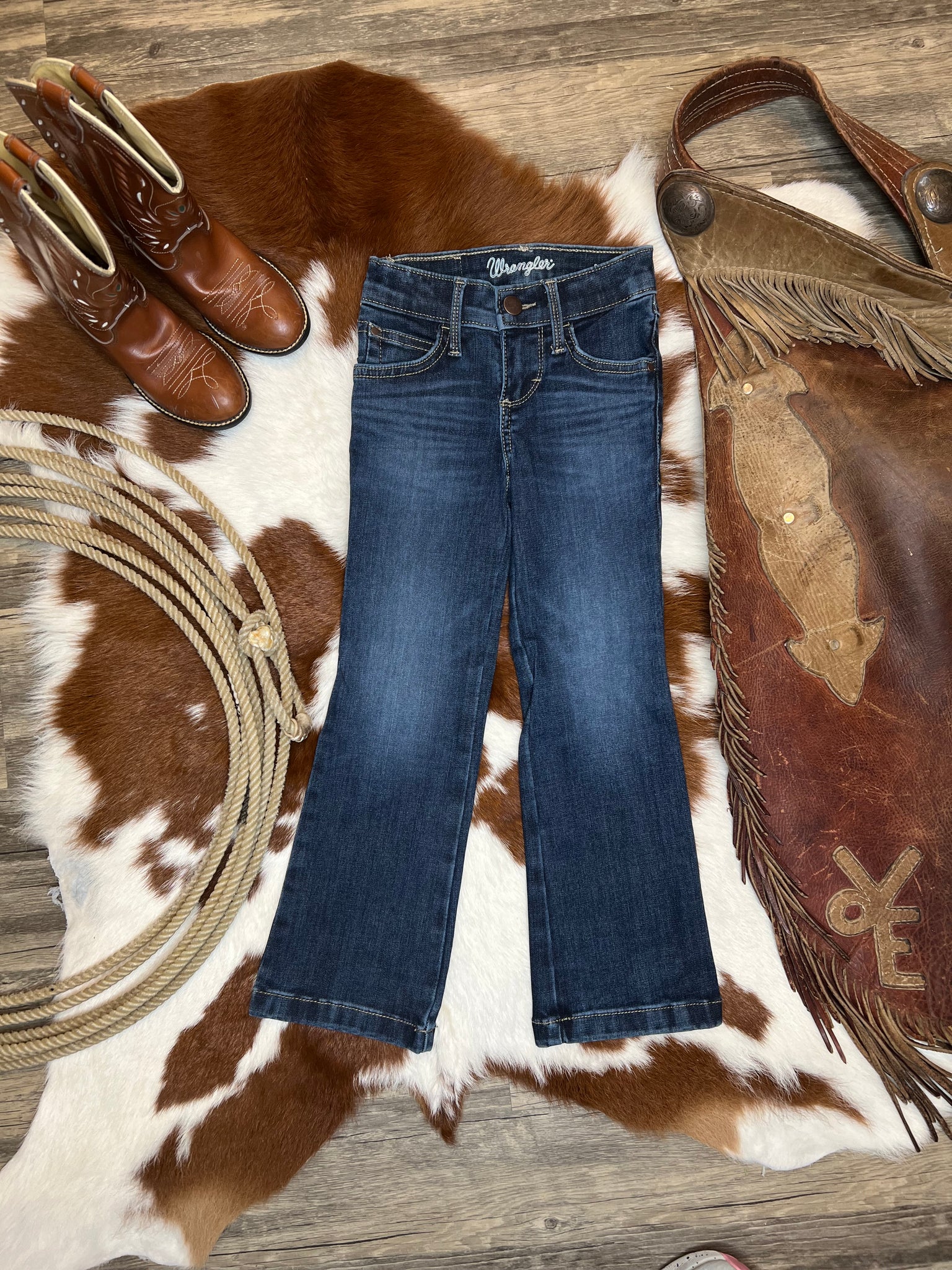 Little girls medium wash boot cut jeans by wrangler. Complete with the inner scrunch button up bands for secure hold on their waist.