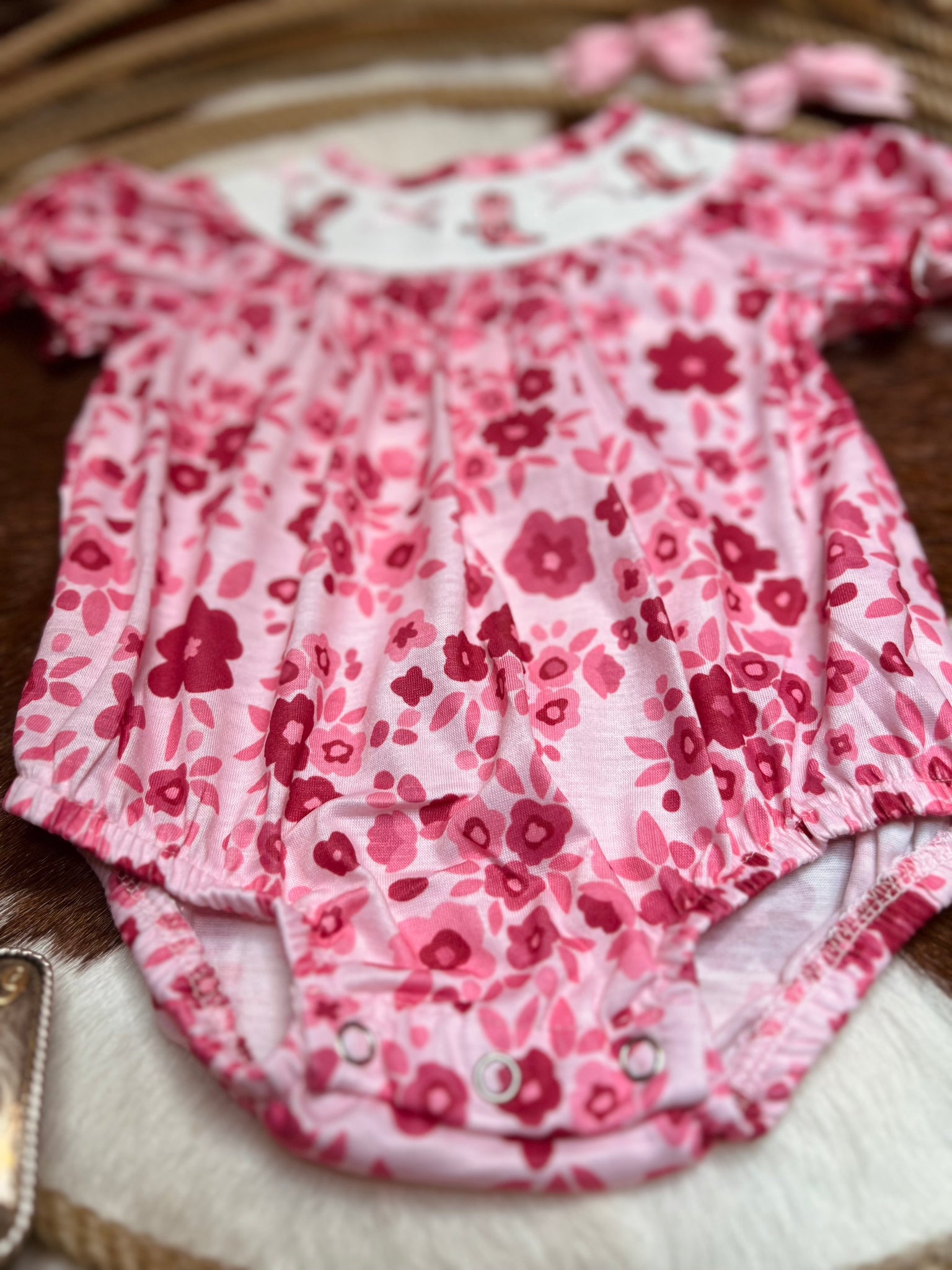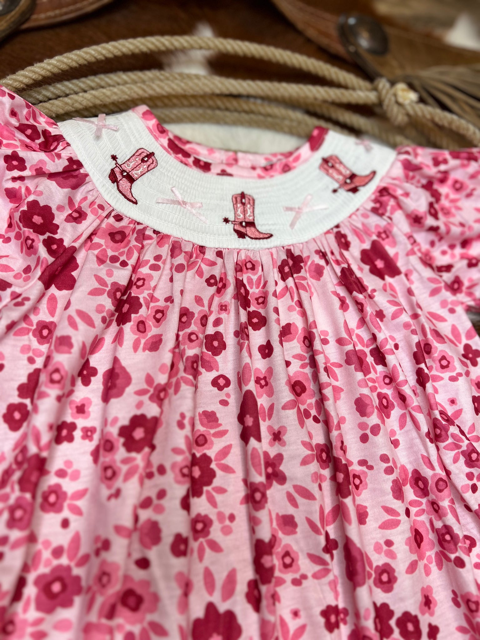 A cute smocking embroidered short sleeve romper (for baby size) and dress for toddlers and up!