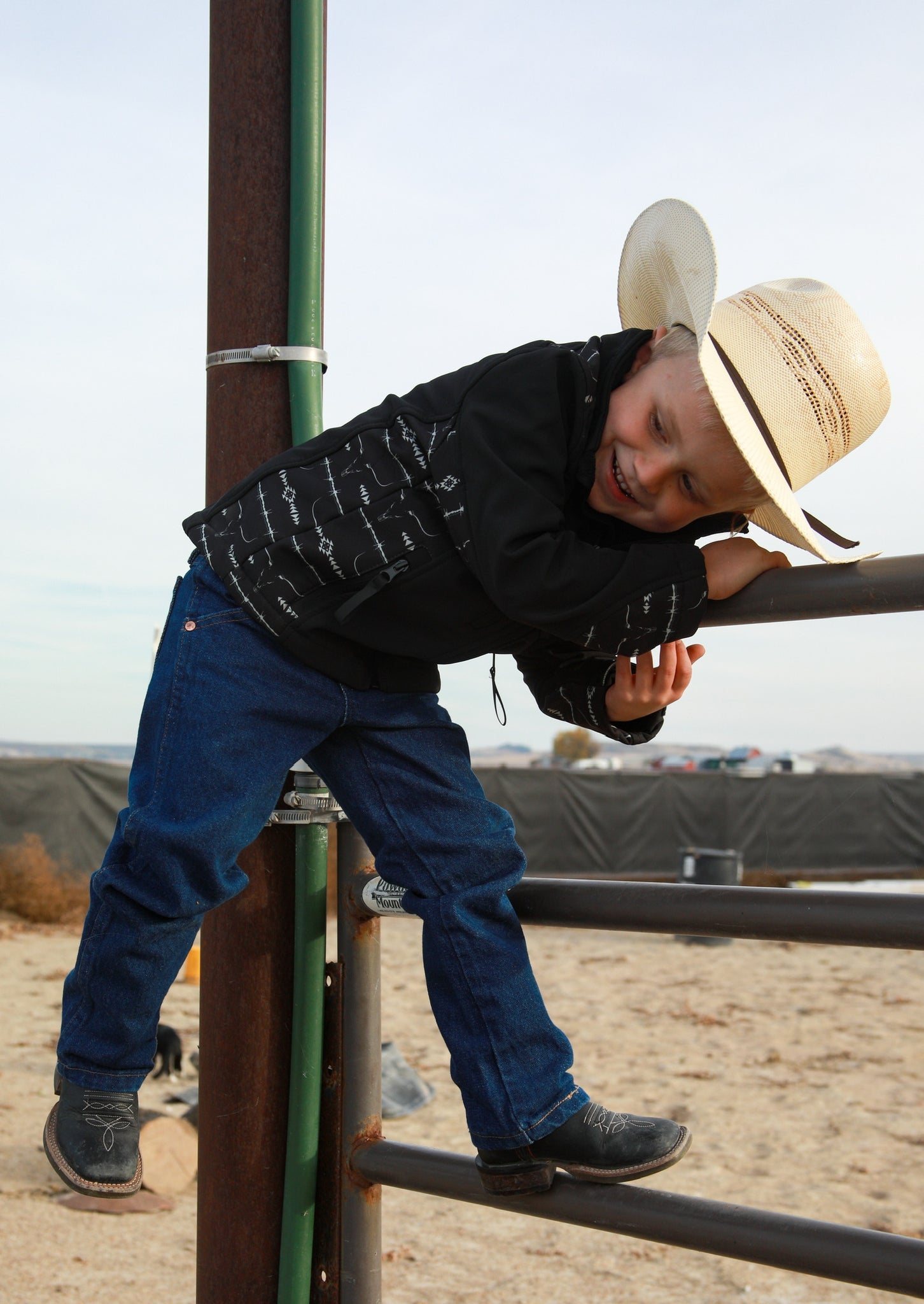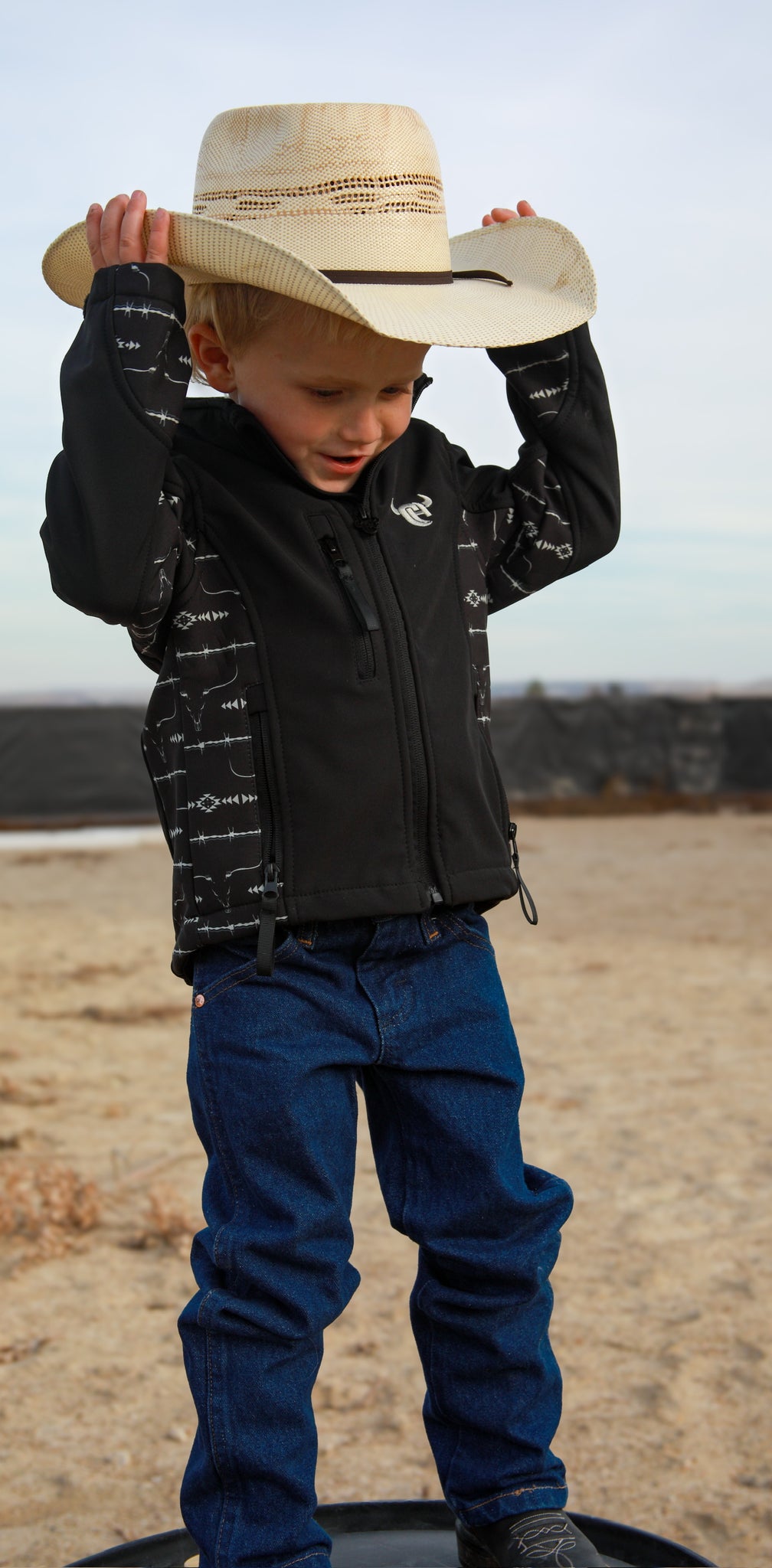 An amazing quality soft shell jacket. Double lined and warm for your little cowkid.