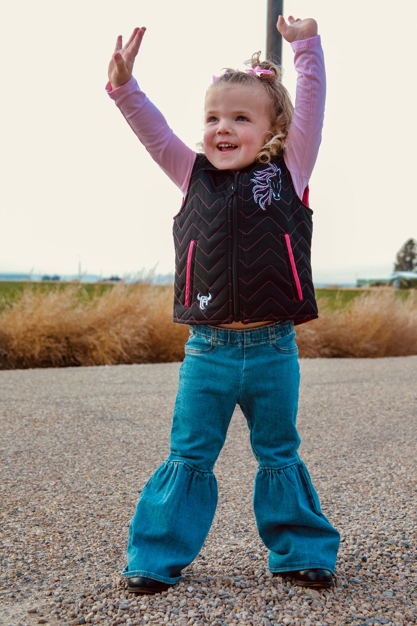 The perfect vest for fall and winter. Comes complete with embroidered horse on the front and back along with bedazzled bling in the horse.