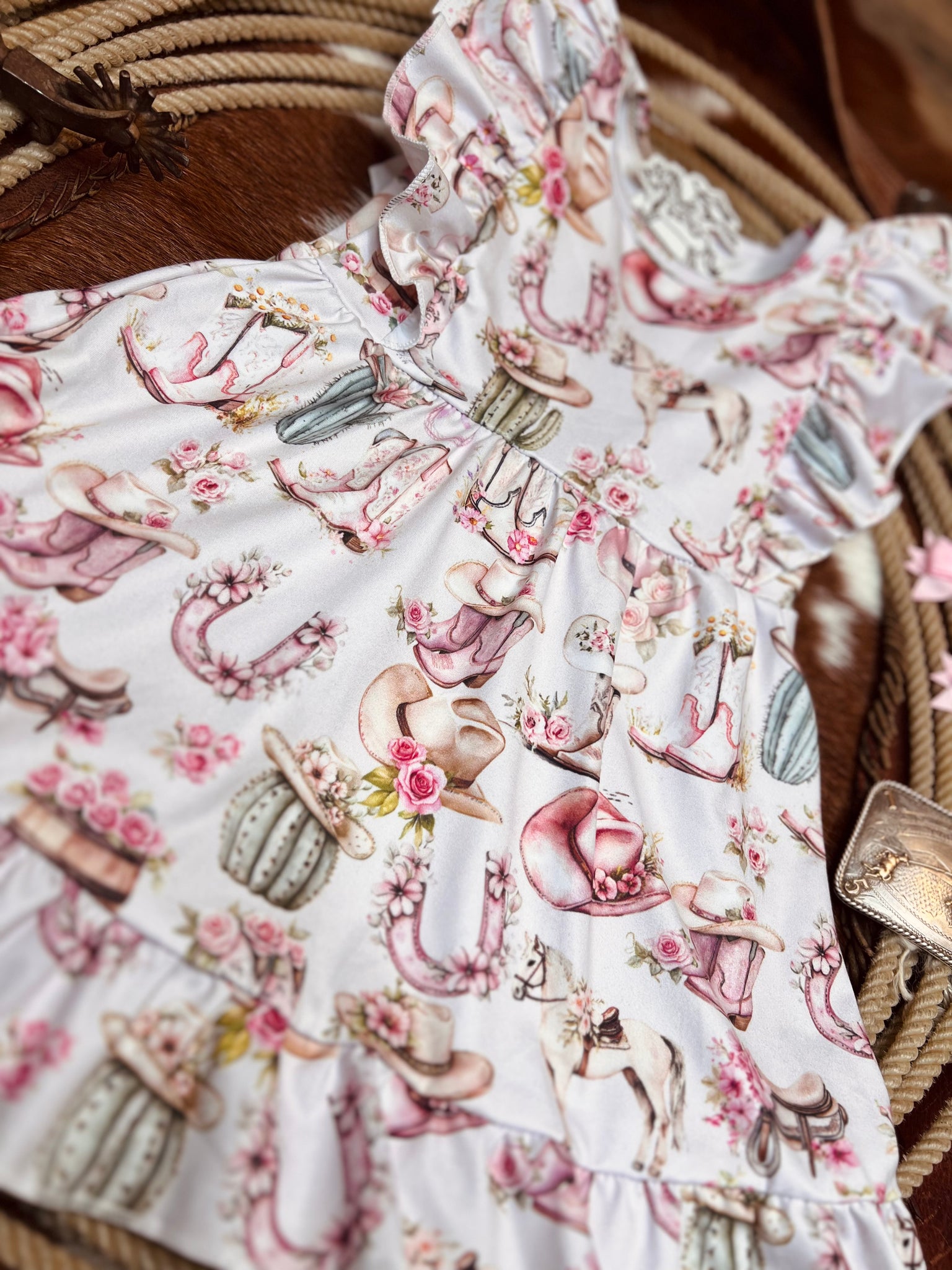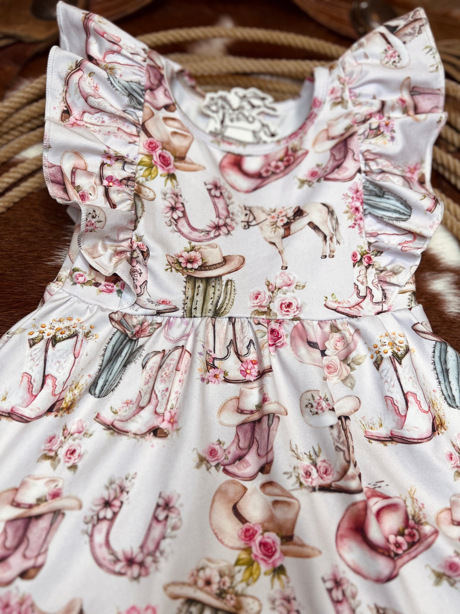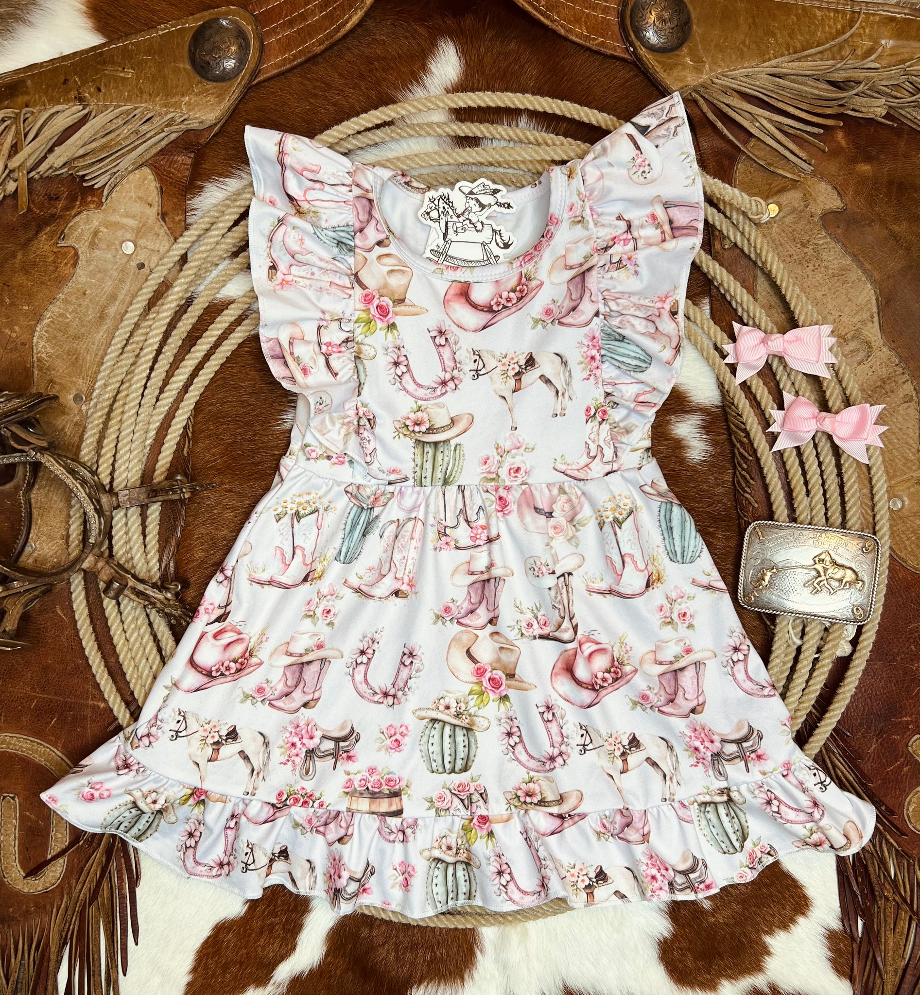 The perfect little girls dress, ready for twirling. Complete with a western graphic collage on it.