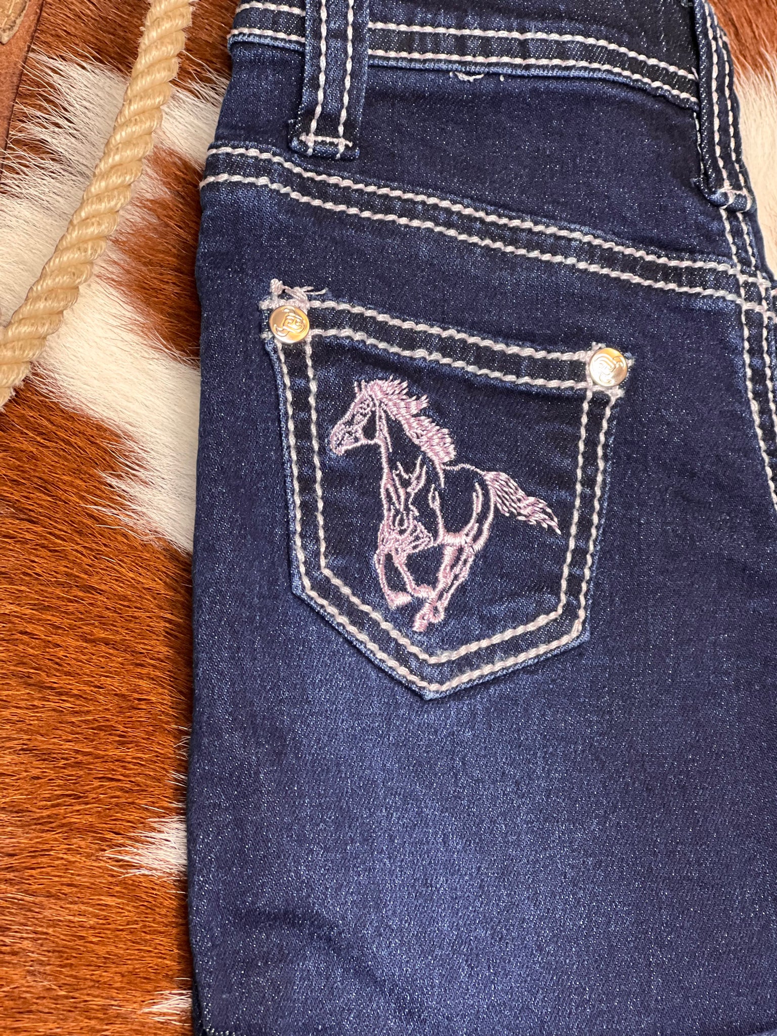 Dark wash denim jeans with a pink embroidered horse on the pockets. Completely with pull strings on the inside waistband to help cinch for a secure fit.